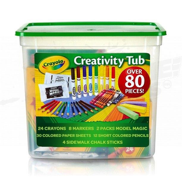 Un juego de arte Crayola Creativity Tub con 80 piezas de materiales para manualidades, desde marcadores y papel para manualidades, para modelar magia y tiza para aceras.